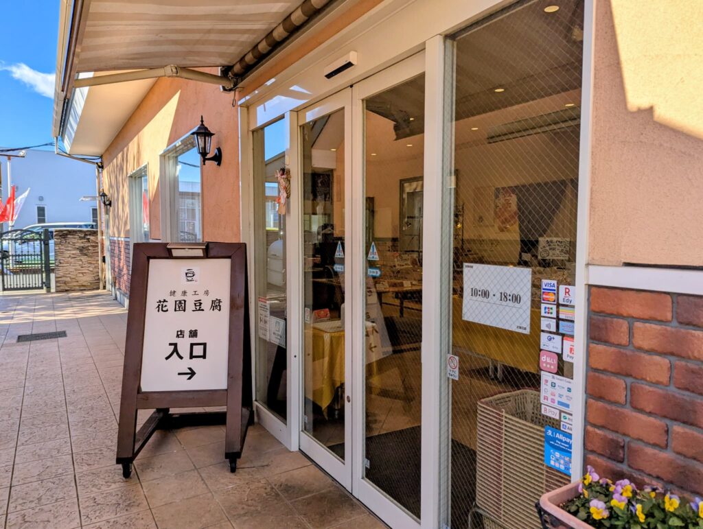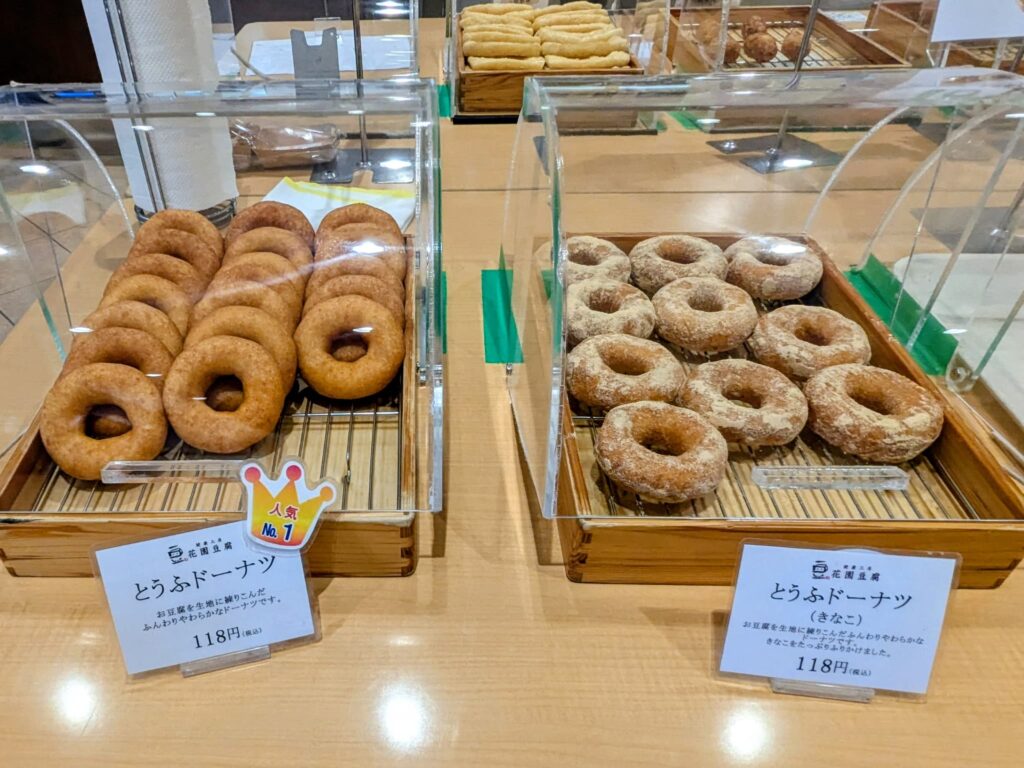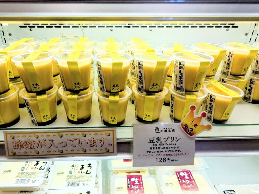 花園豆腐では、豆腐を使ったスイーツや大豆製品が豊富に並び、ヘルシーでタンパク質が豊富。