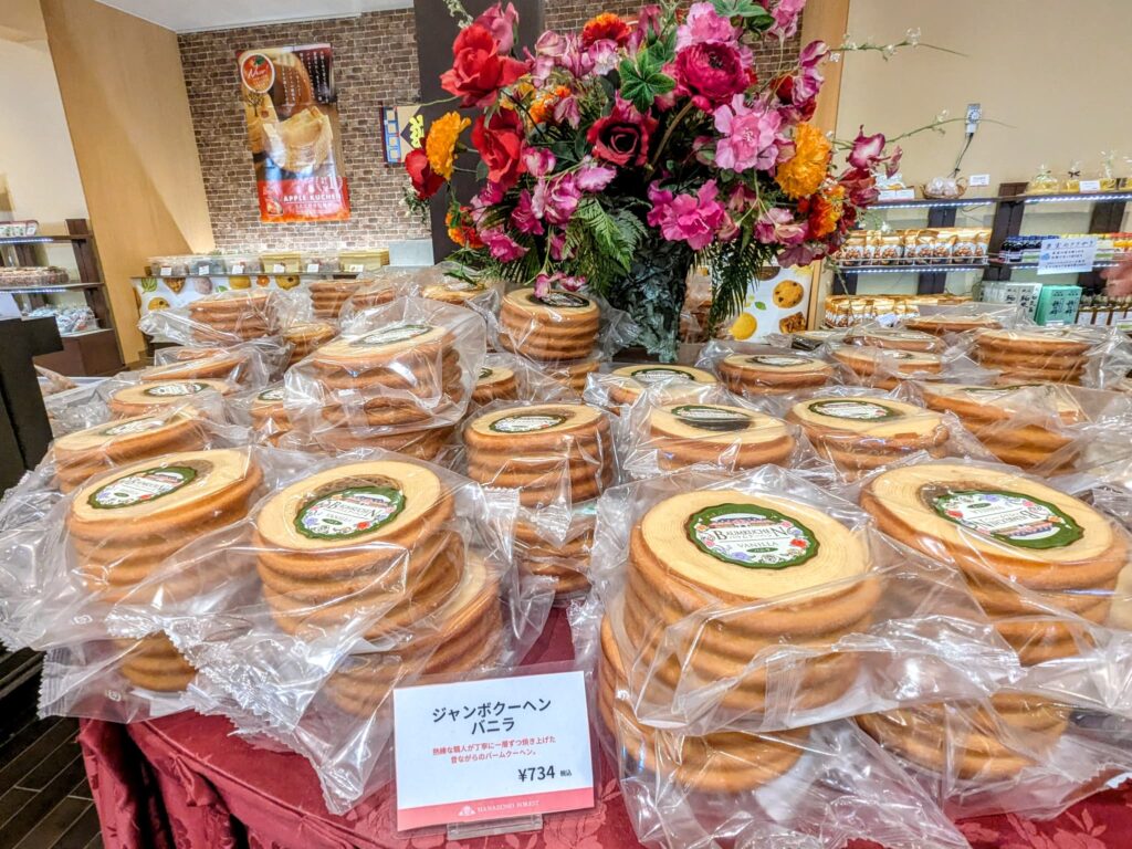 店内に入ると、バームクーヘンや焼き菓子のアウトレットがずらりと並び、思わず足を止めてしまいます。