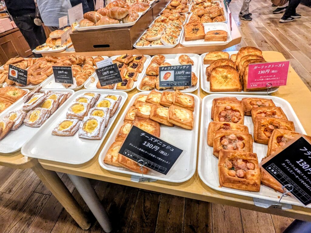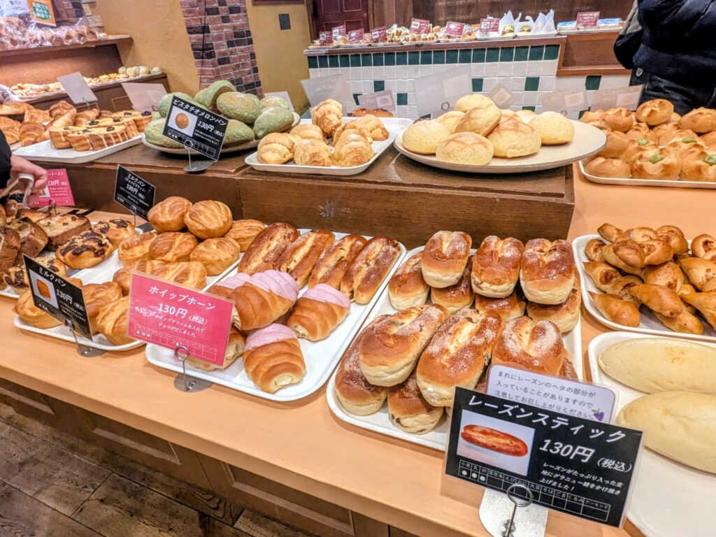 パン屋さんでは、焼き立てパンがほとんど130円で販売されており、種類も豊富。