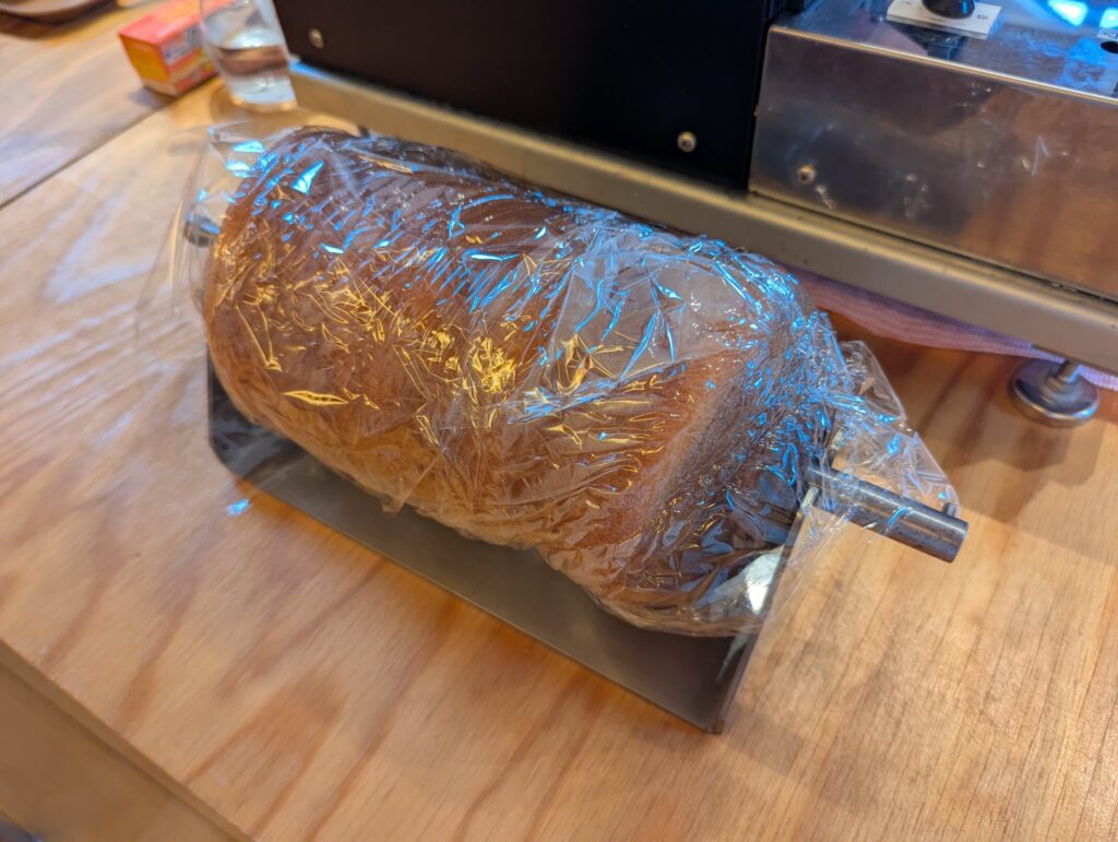 バウムクーヘンが焼き上がり、店員さんが手際よくラップをかけてくれた後は、熱が冷めるまでしばし待ち時間があります。