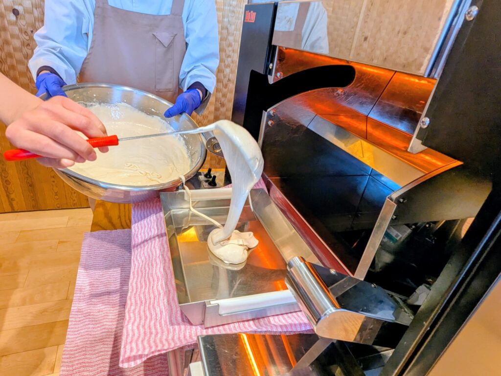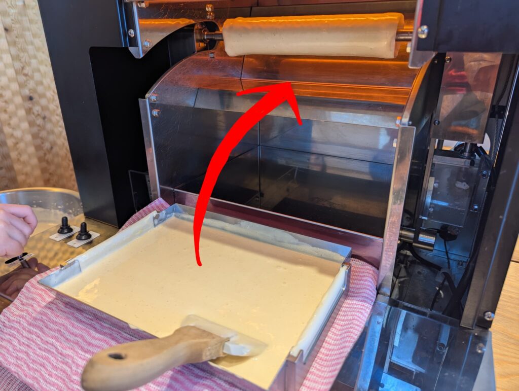 生地はすでに準備されており、お店で販売されているバウムクーヘンと同じ生地なので美味しさは保証済みです。