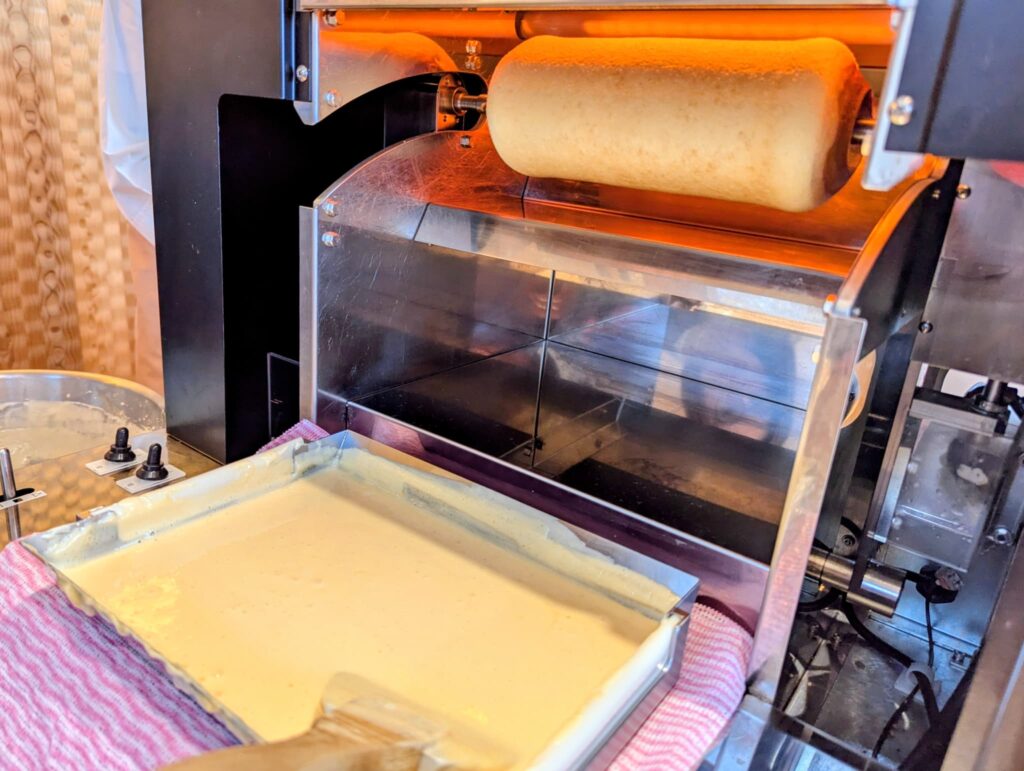 そこから機械を操作して、生地を少しずつ芯に巻き付けていきます。