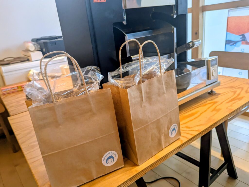 生バウムを食べ終える頃には、焼き上がったバウムクーヘンも程よく冷め、持ち帰りの準備へ。