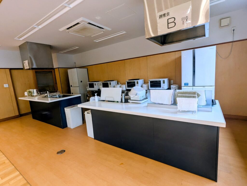 共用のリビングとキッチンは広々としており、大人数でも余裕のある空間です。