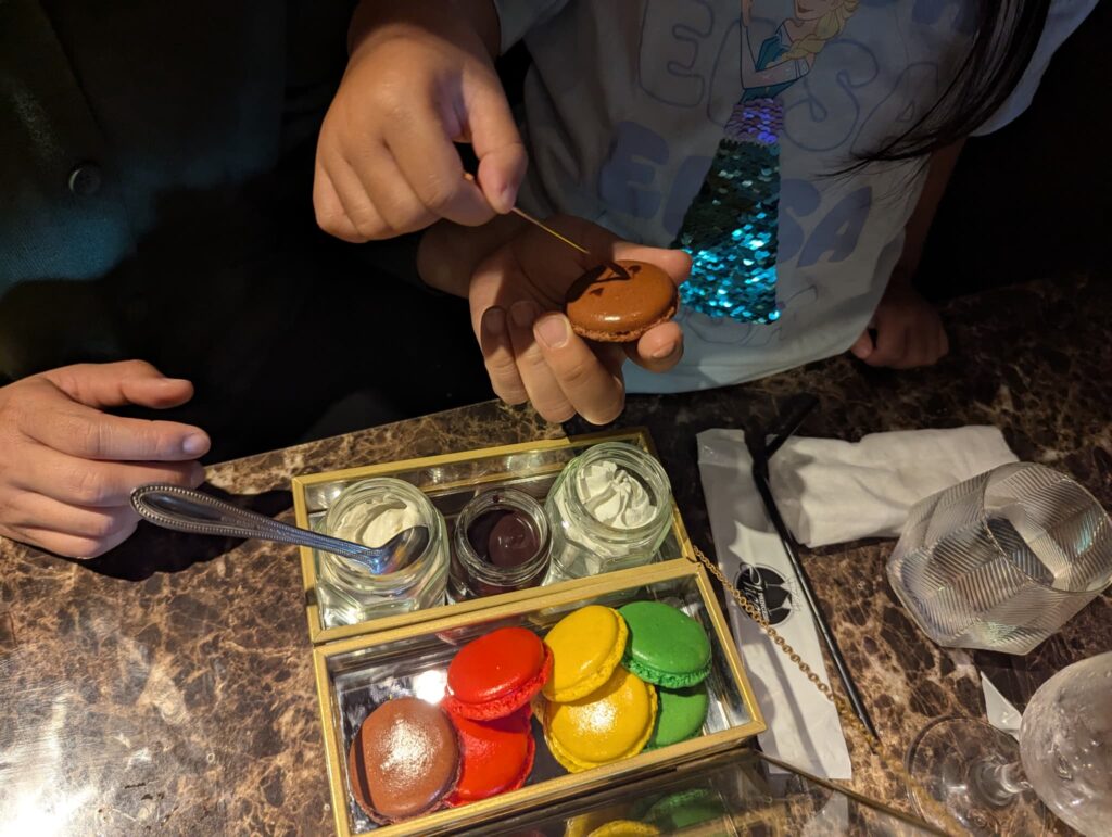 実際に宝石箱のような容器に、色とりどりのマカロンやチョコ、ホイップクリームなどが美しく並び、自分で飾り付けながら食べられるという楽しさ付き。