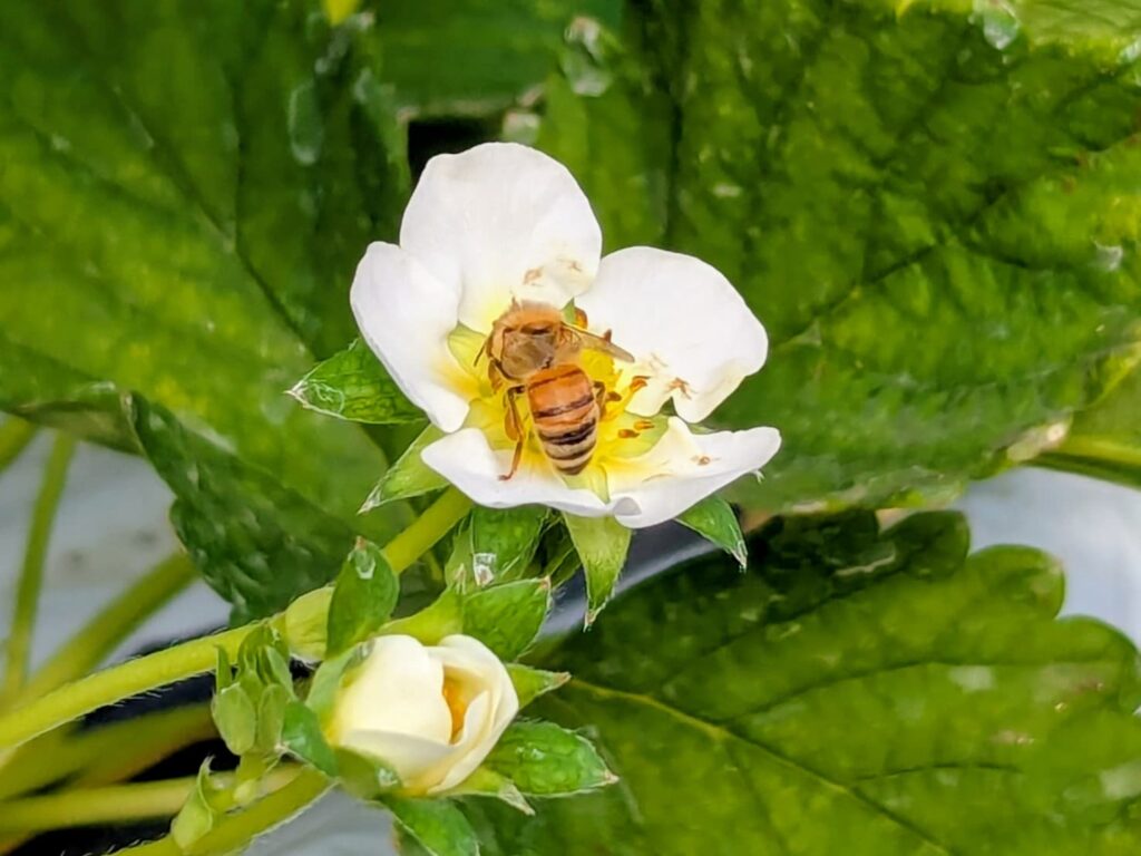 いちごハウスの中では、ミツバチも大切な働き手です。